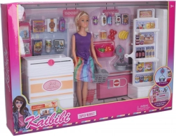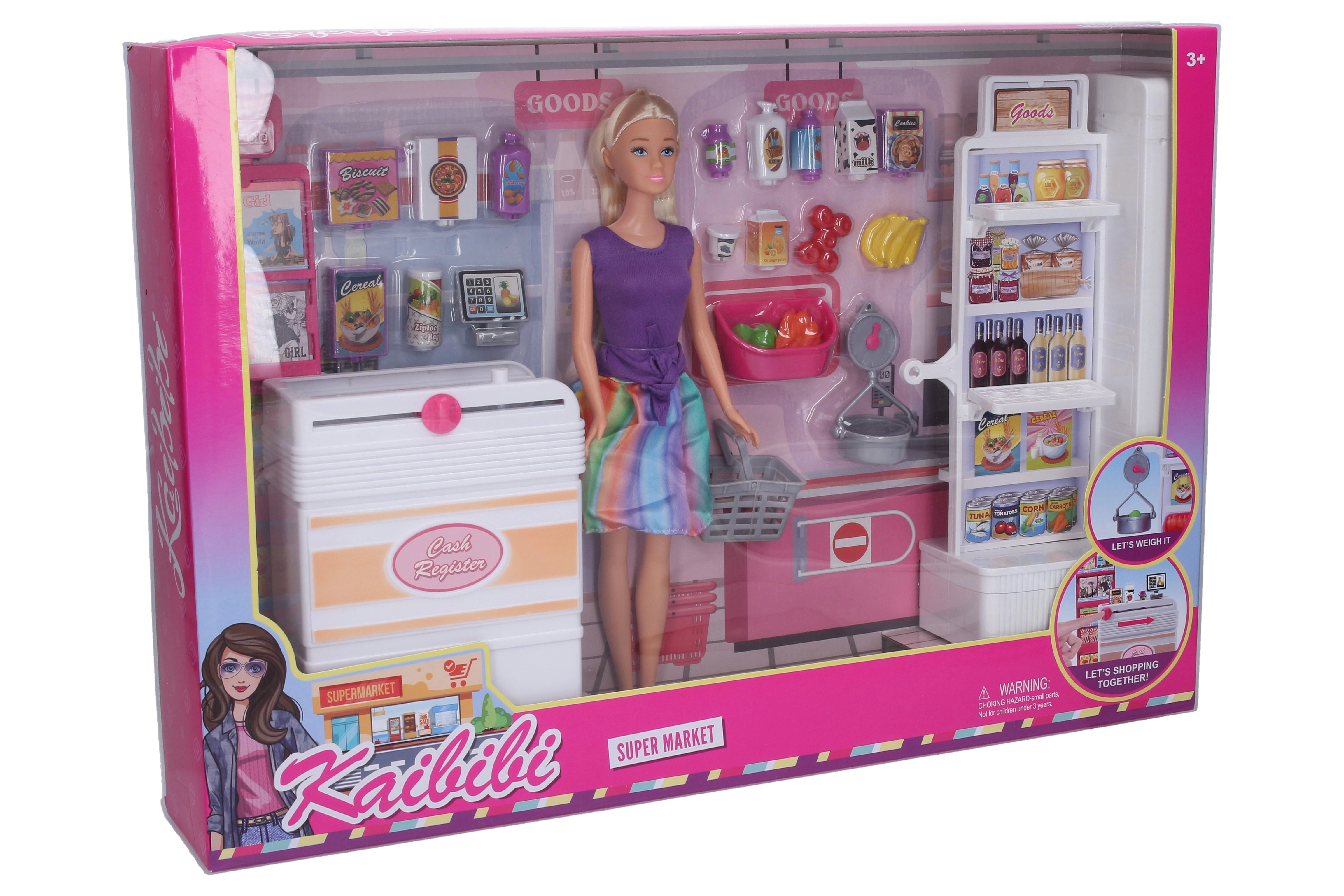 - Bambola, scaffale per la merce, generi alimentari e prodotti, cassa con nastro, cestino della spesa, altri accessori