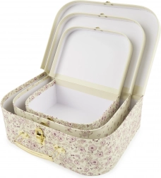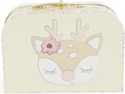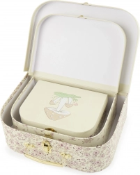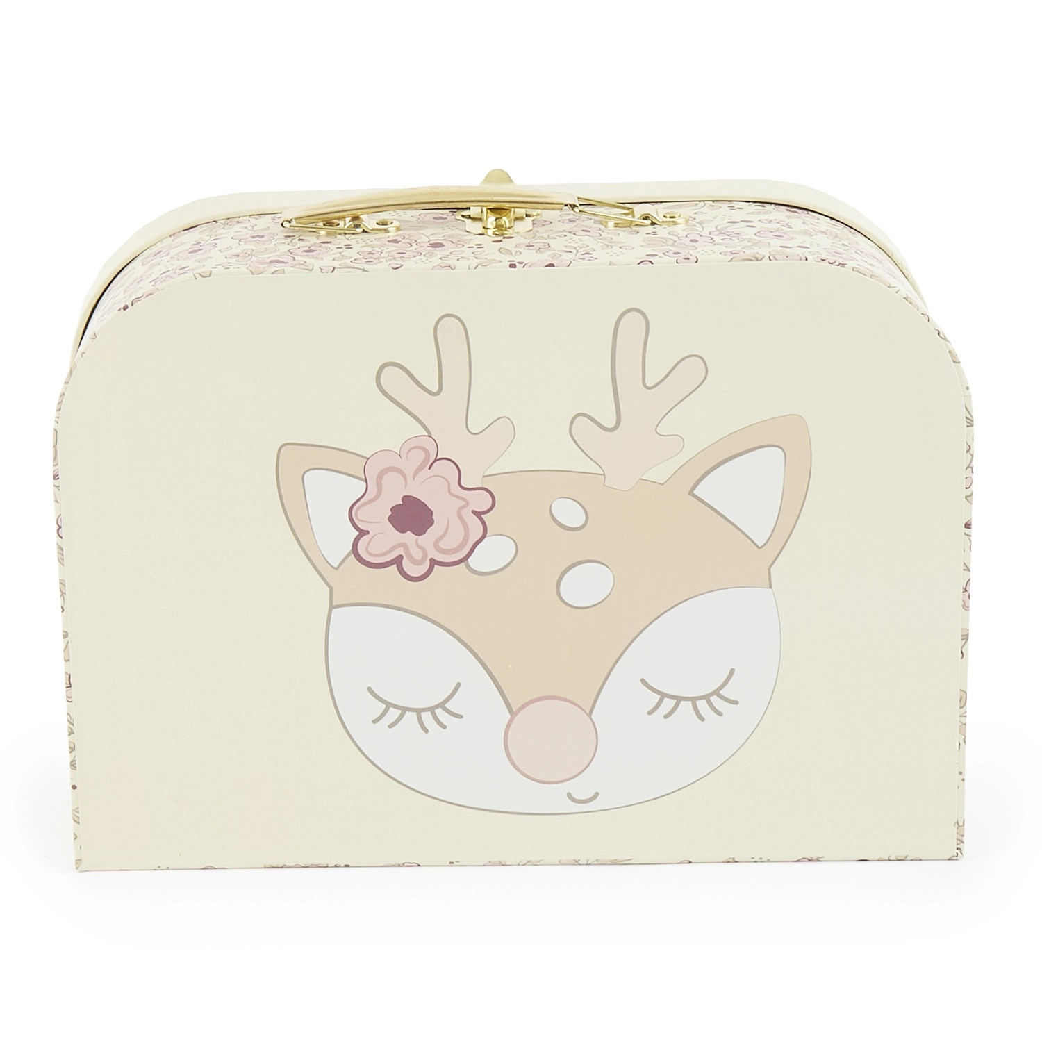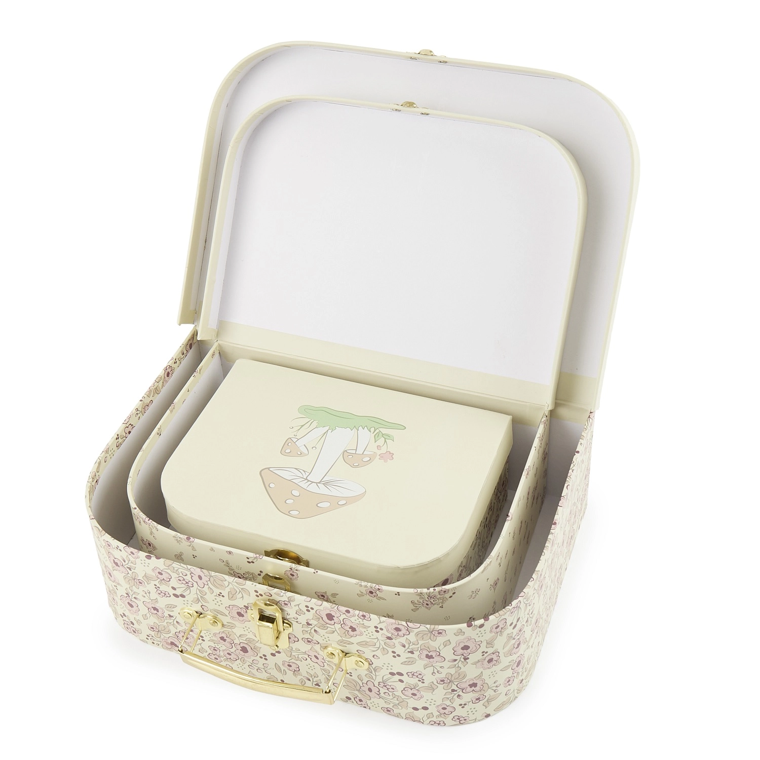Un set elegante di tre valigette in cartone illumina la cameretta e i viaggi. Combina il dolce motivo della cerbiatta Ella, il pattern floreale vintage, una robusta clip in metallo e una comoda maniglia. Grazie al design impilabile (nesting), le valigette sono salvaspazio, leggere e perfette per riporre tesori, giochi e piccoli oggetti.