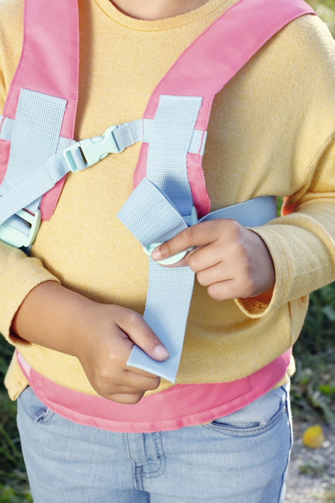 Spallacci imbottiti, fibbia pettorale e cintura lombare si adattano facilmente a diverse altezze dei bambini e mantengono la bambola stabile.
