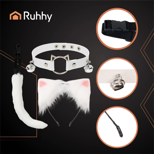 - Coda con regolazione, choker regolabile con campanellini, cerchietto con orecchie, confezione