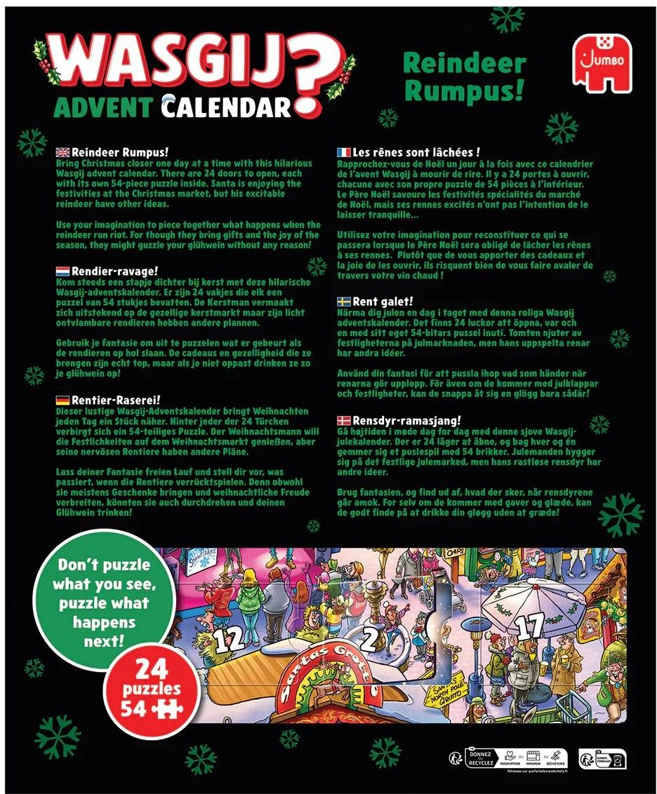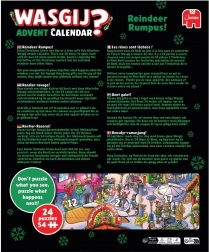 Rendi l’attesa della Vigilia ancora più divertente con il calendario dell’Avvento WASGIJ: Renne scatenate! Questo calendario propone un concetto unico, in cui l’immagine finale non coincide con quella sulla confezione. Cerchi indizi, dai spazio all’immaginazione e componi la scena da un’altra prospettiva. Un regalo ideale per gli amanti dei puzzle e per i puzzler esperti in cerca di qualcosa di nuovo.