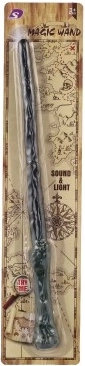 Bacchetta magica per piccoli maghi con effetti luminosi e sonori. Accessorio ideale per il costume, lunghezza 36 cm, plastica resistente. Batterie 3× AG13 incluse, adatta dai 3 anni.