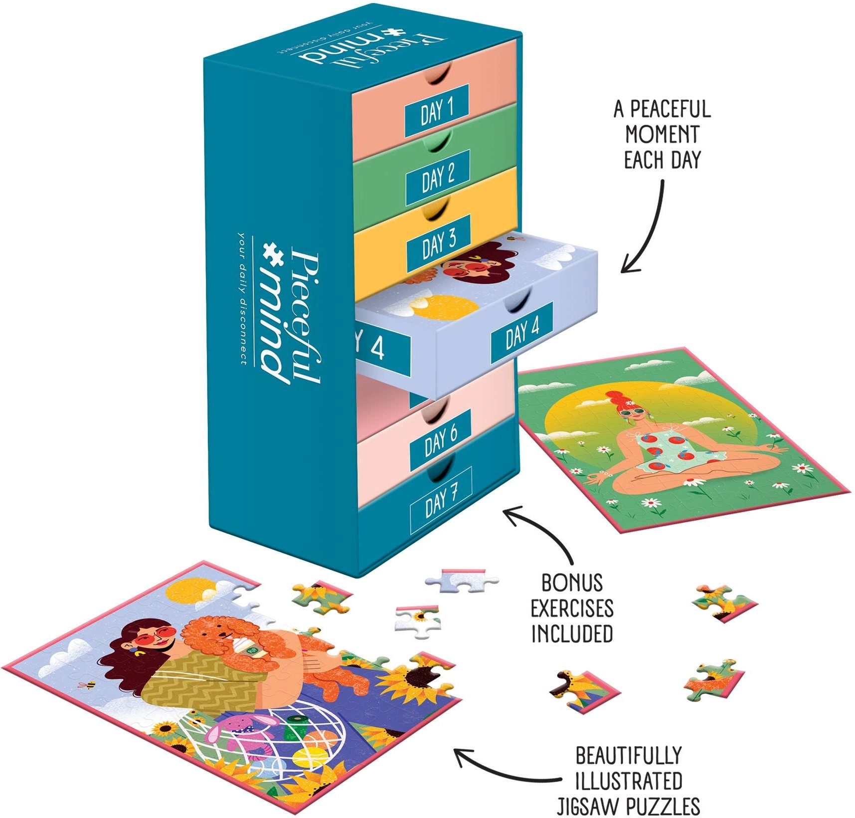 Concediti calma e concentrazione con la collezione di mini puzzle che favoriscono rilassamento, mindfulness e buon umore. La confezione include 6 motivi distensivi da 54 pezzi ciascuno per ogni giorno, ideali per una breve pausa di 20 minuti tutta per te.