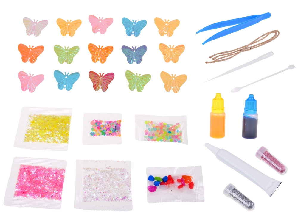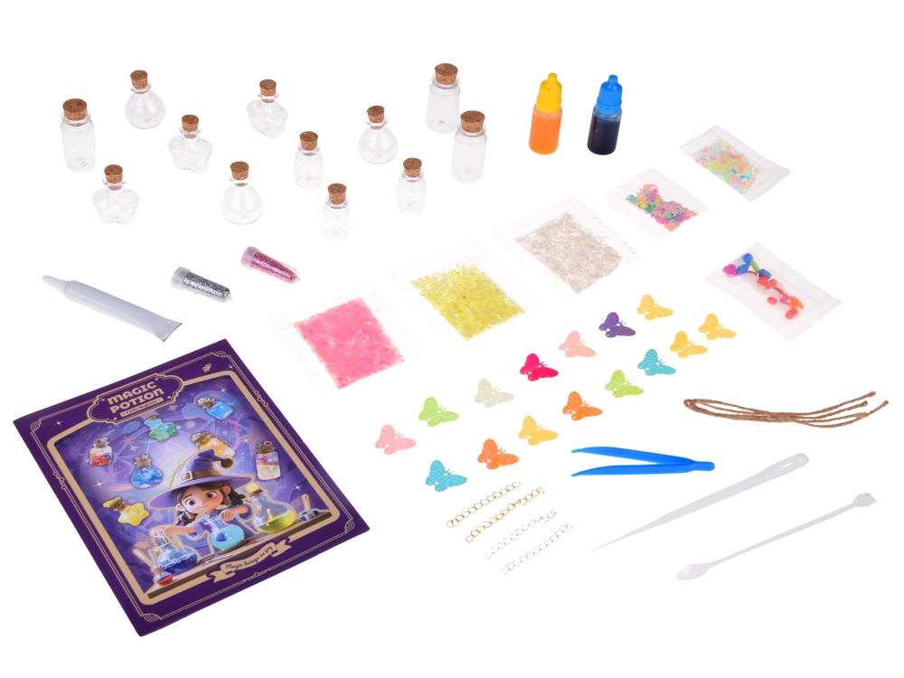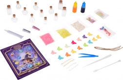 Scopri quanto è facile e divertente creare le tue pozioni decorative! Questo set creativo per bambini include mini boccette di vetro con tappo di sughero, glitter, pigmenti, decorazioni con paillettes, ciondoli a forma di farfalla e pratici strumenti per un dosaggio preciso. I bambini allenano motricità fine, creatività e fantasia mentre mescolano i colori, riempiono e decorano le loro pozioni magiche.