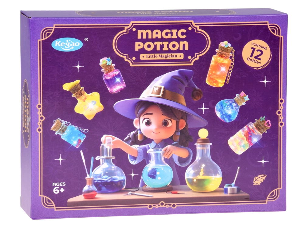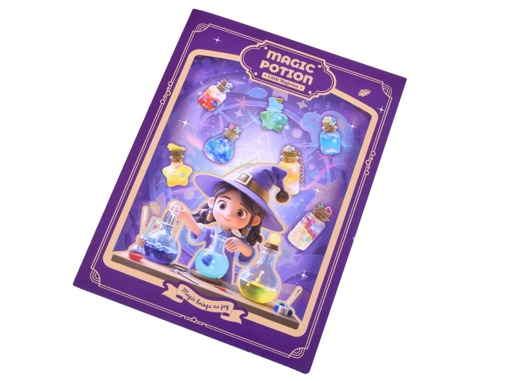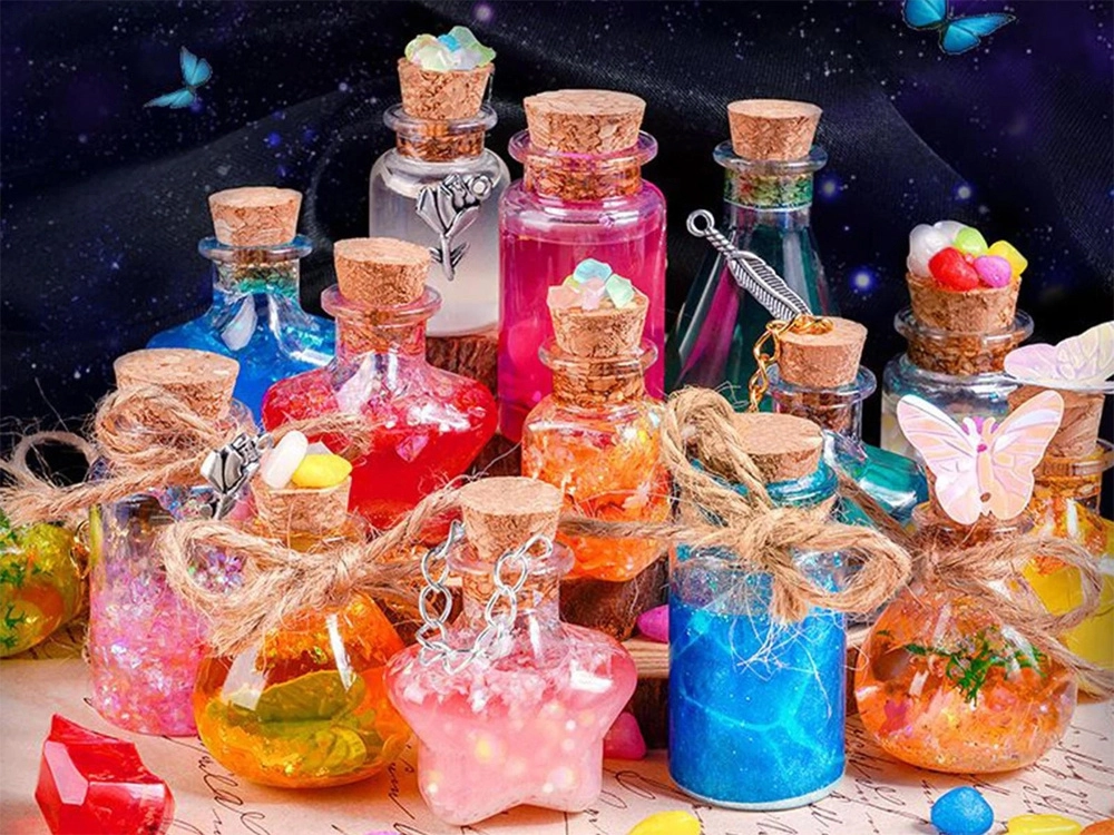 Il set per creare “pozioni magiche” trasforma ogni idea in una mini opera scintillante. Basta versare glitter e decorazioni nella boccetta, aggiungere acqua con pigmento, chiudere con il tappo di sughero e rifinire con i ciondoli. Il risultato può essere un ciondolo, un talismano o una graziosa decorazione per la cameretta.