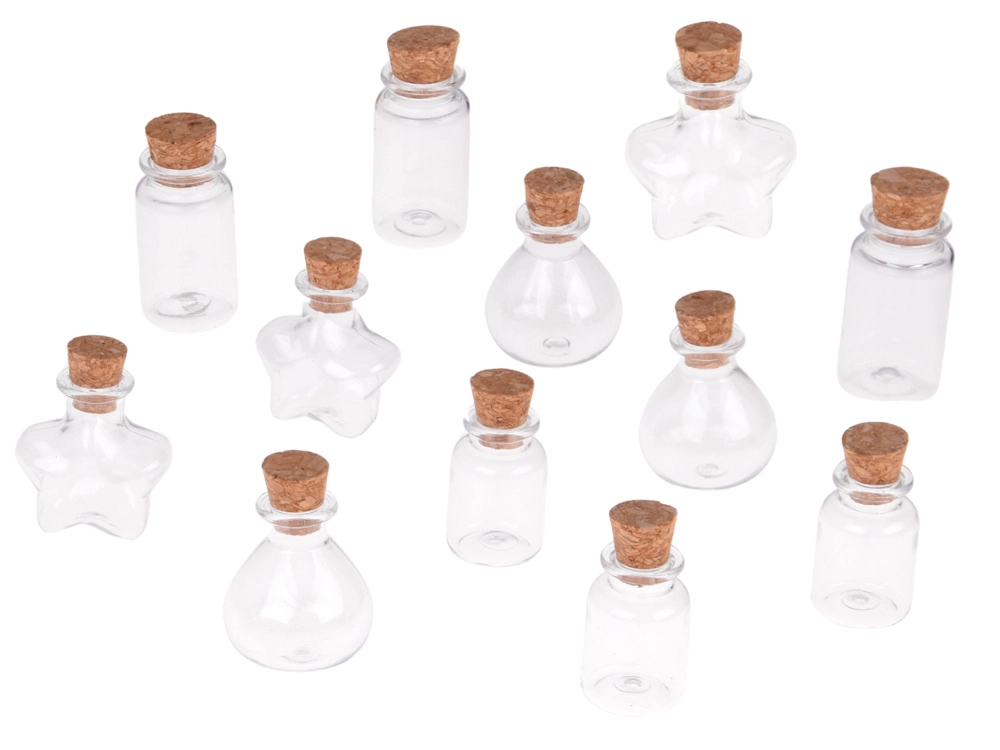 Vetro trasparente in diverse forme (cilindro, goccia, stella, ecc.) per un bellissimo effetto pozione. Ideali per glitter, perline e liquidi colorati.