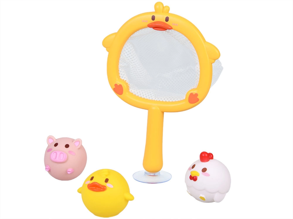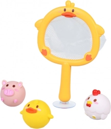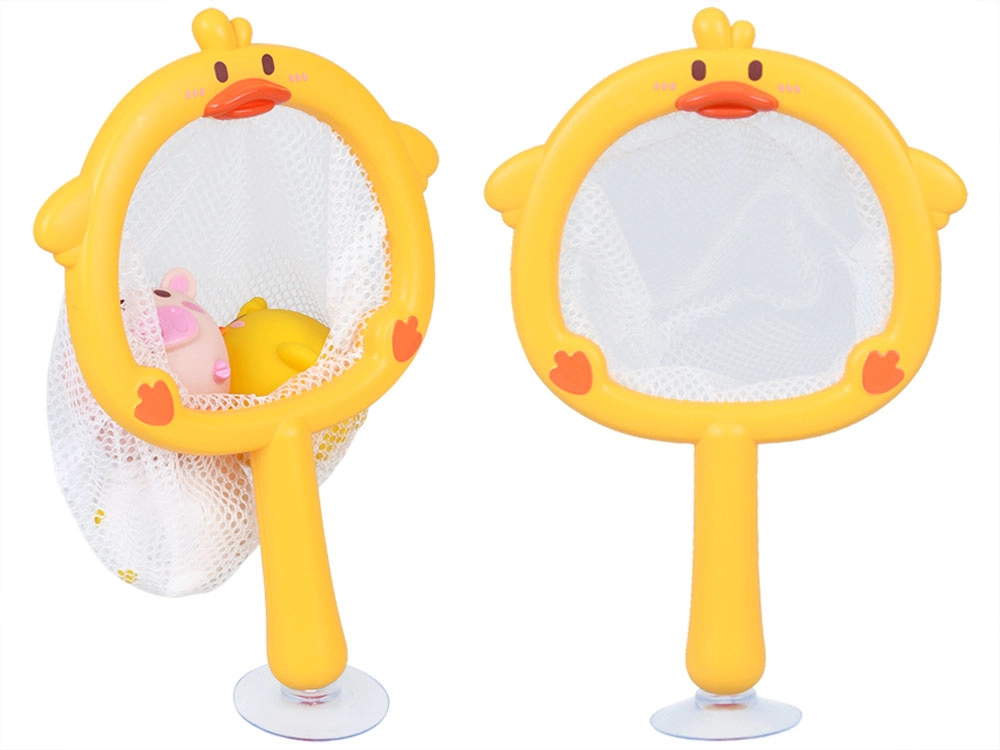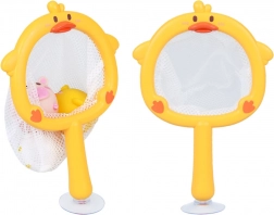 Il retino a forma di papera con ventosa aderisce alle superfici lisce. I bambini possono pescare gli animaletti, riporli e lasciarli sgocciolare – mettere ordine nella vasca diventa un gioco.
