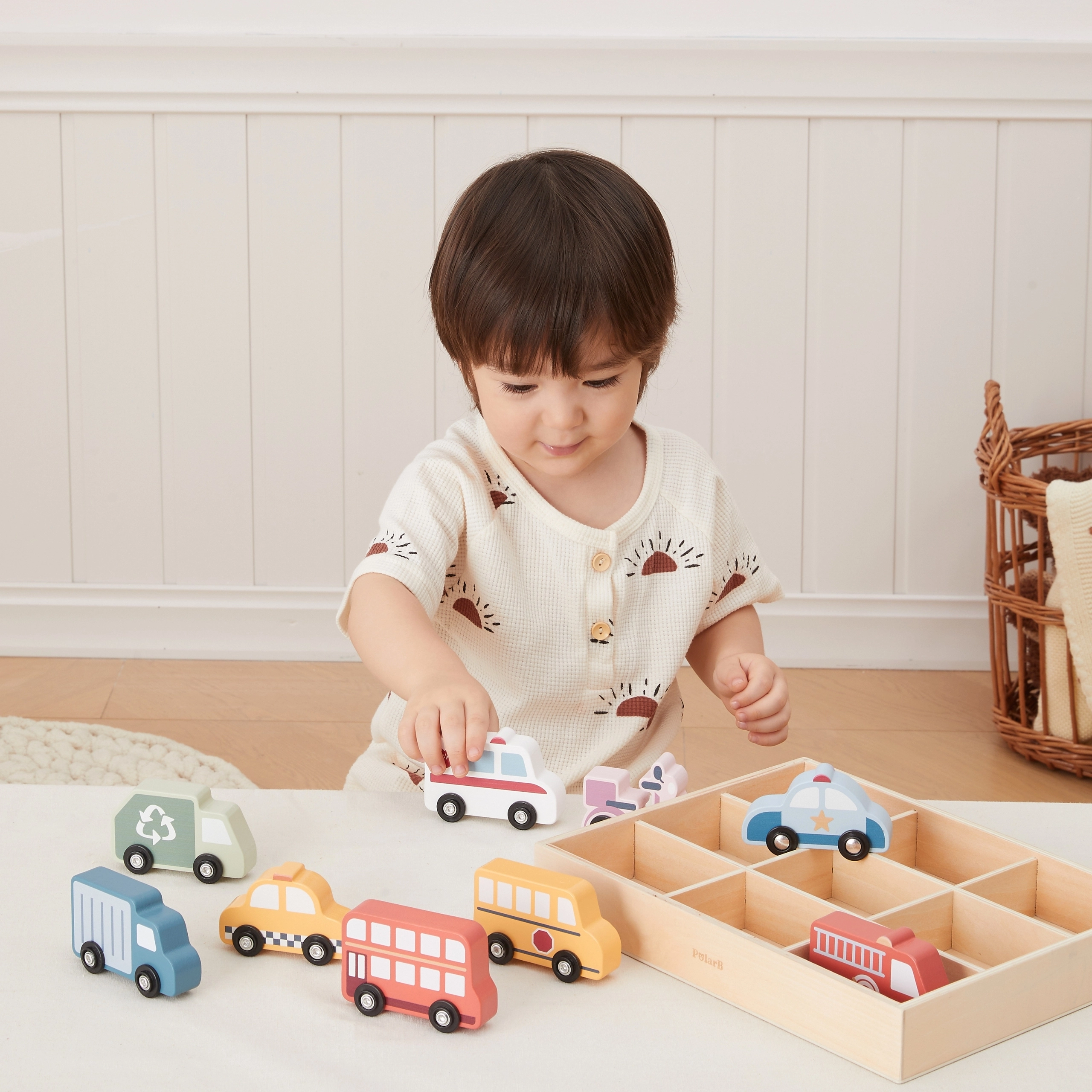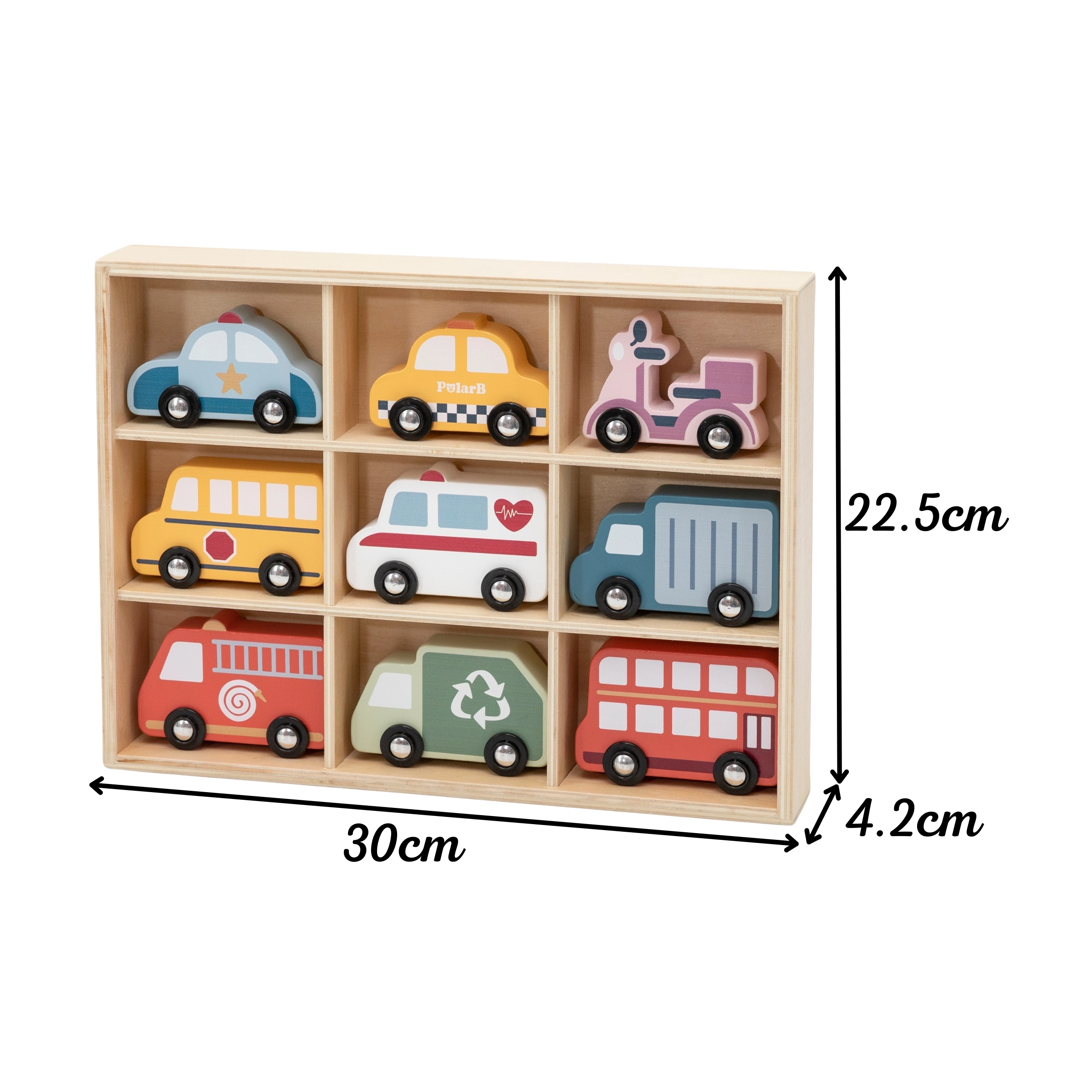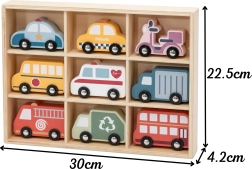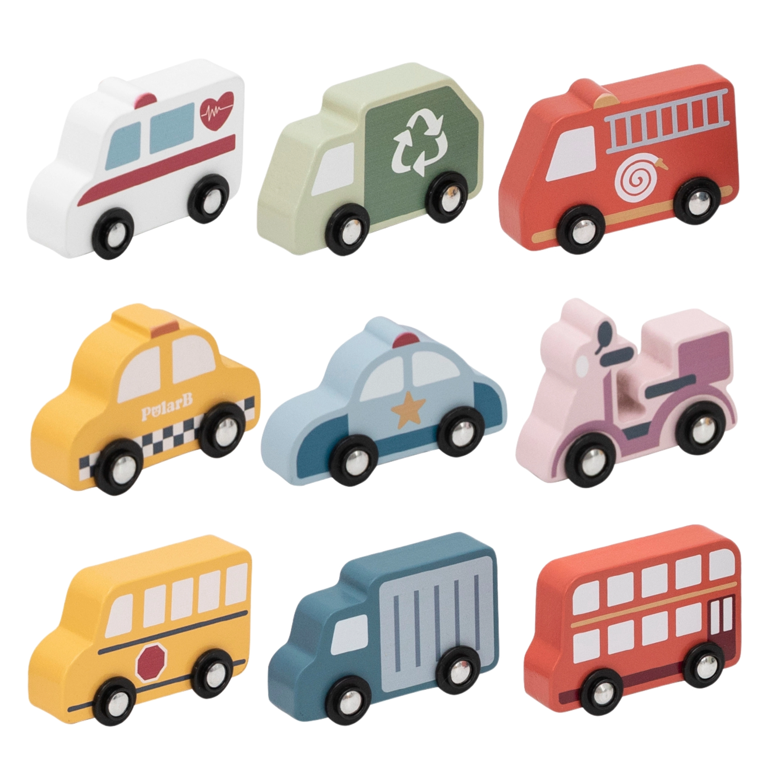 Questo set in legno di alta qualità offre tutto ciò che serve ai bambini per giocare creativamente alla città: camion dei pompieri, ambulanza, polizia, taxi, autobus (incluso quello a due piani), camion dei rifiuti, scooter e altro. Le dimensioni compatte e i bordi arrotondati sono sicuri e comodi per la presa dei bambini; le ruote scorrono dolcemente su qualsiasi superficie.