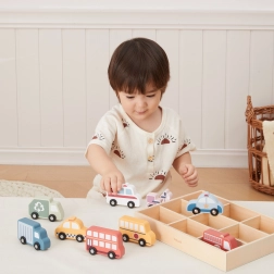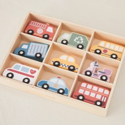 Grazie al pratico organizer in legno con scomparti, il riordino è rapido e intuitivo: i bambini possono anche classificare e imparare a distinguere i tipi di veicoli. Il set favorisce il gioco di ruolo, lo sviluppo delle abilità comunicative e la comprensione del lavoro dei servizi cittadini.