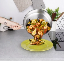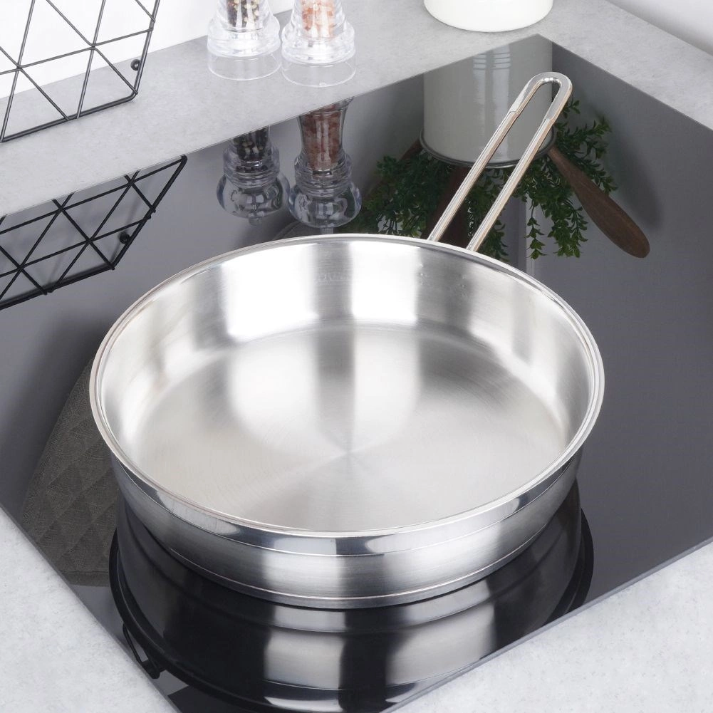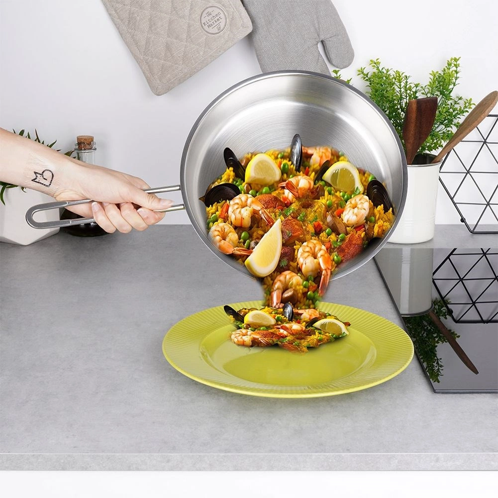 Questa padella in acciaio inox dal design senza tempo è un’ottima scelta per preparare carne, verdure e crêpe. Realizzata in acciaio inox di alta qualità con finitura opaca e un elegante bordo lucido sulla parte superiore, offre lunga durata e resistenza alla corrosione. Le pareti robuste e la costruzione stabile assicurano una distribuzione uniforme del calore e prestazioni affidabili per fritture e rosolature.