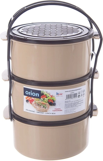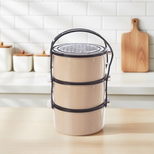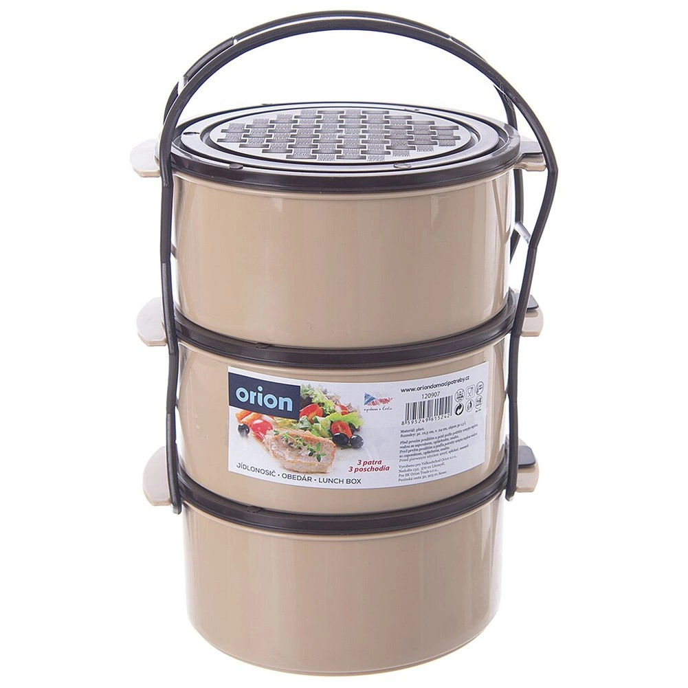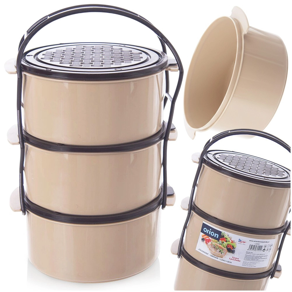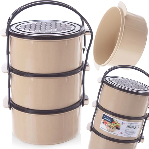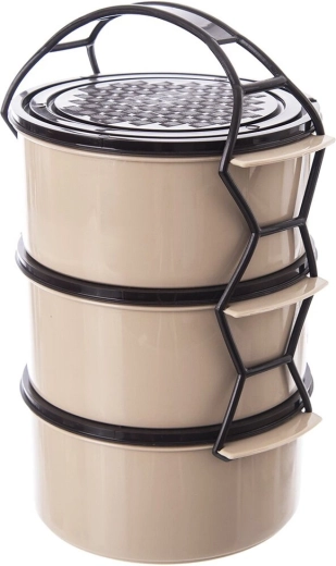 Pratico contenitore portapranzo a tre livelli con capacità di 3 × 1,5 l che mantiene il cibo ben separato e sicuro da trasportare. Il telaio robusto con maniglia di trasporto, i coperchi separati per ogni contenitore e la struttura in plastica resistente in combinazione beige–marrone garantiscono uso facile a casa e in viaggio. Adatto per lavastoviglie, frigorifero, congelatore e per microonde senza coperchi.