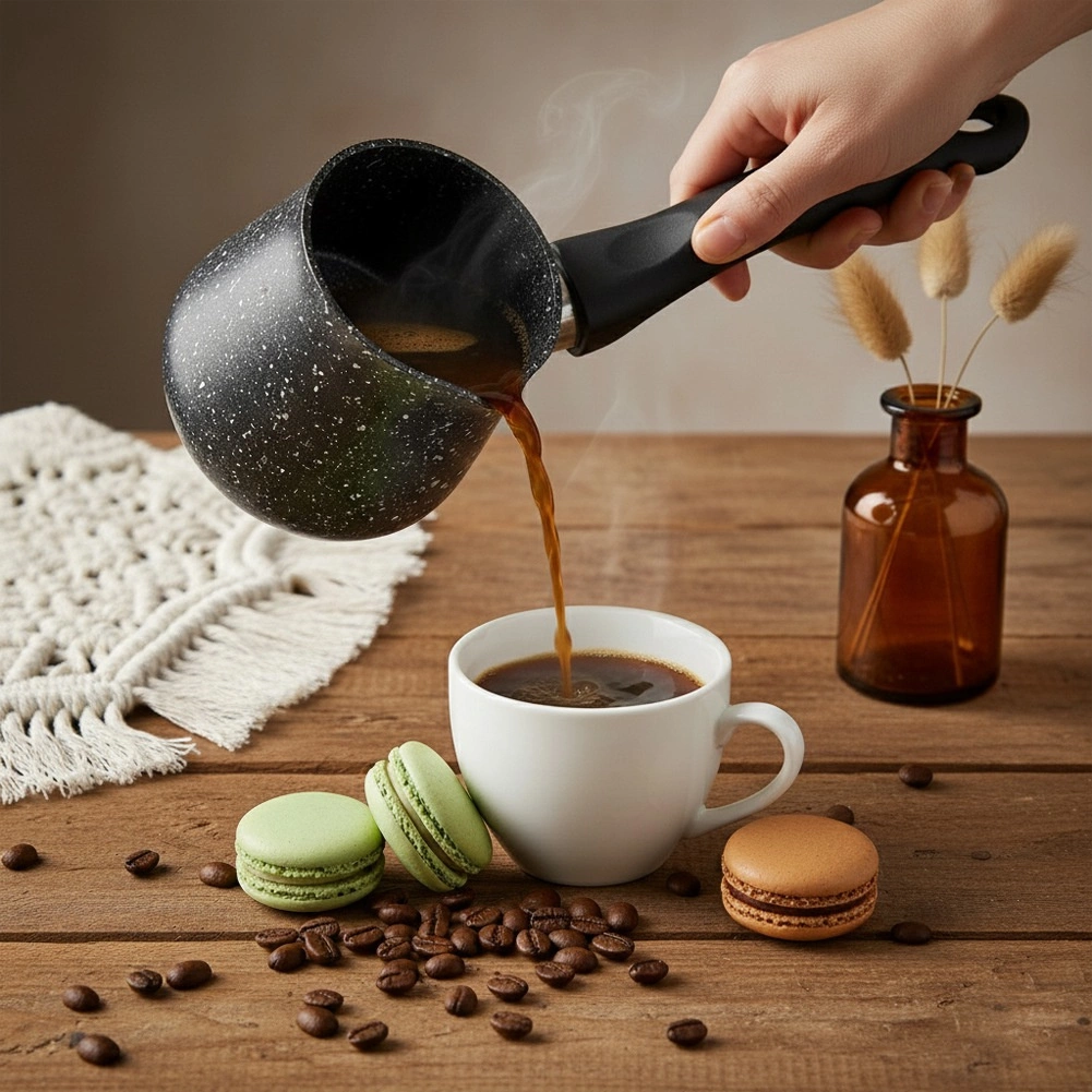Scopri la preparazione tradizionale del caffè turco con il comfort moderno. La cezve in granito Grande combina un robusto corpo in alluminio con un rivestimento antiaderente per una cottura pulita senza attaccare. Grazie al bordo ampio con beccuccio versi la bevanda con precisione e senza gocce, mentre il manico lungo garantisce una presa sicura e confortevole.