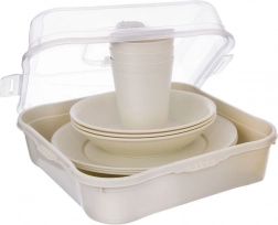 • Dotazione da 13 pezzi per 4 persone: piatti piani e fondi, tazze e box di trasporto.
