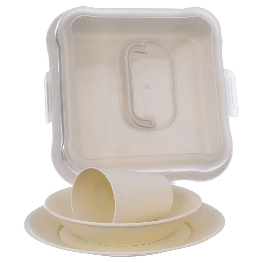 Leggero e resistente set da picnic in plastica da 13 pezzi con pratico box di trasporto con clip e manico. Ideale per picnic, campeggio e gite. Le stoviglie sono adatte a microonde, freezer e lavastoviglie, riutilizzabili e idonee al contatto con gli alimenti.