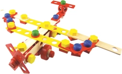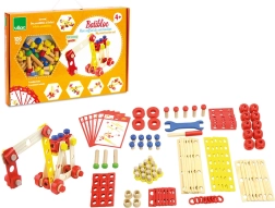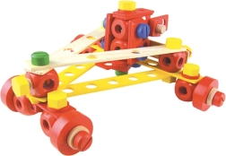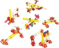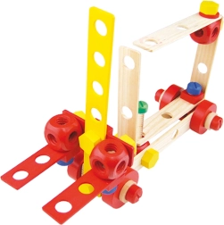 Elementi colorati e naturali, viti, dadi, ruote e giunti permettono ai bambini di assemblare veicoli e costruzioni fantasiose e di riconfigurarle all’infinito.