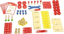 La confezione comprende anche carte con istruzioni chiare che guidano passo dopo passo i piccoli costruttori attraverso diversi progetti. Il set incoraggia il gioco guidato dalle istruzioni e la libera creatività, il tutto in modo sicuro, con robusto legno massello.