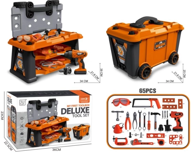 Set da officina portatile per piccoli fai-da-te in una pratica valigetta con ruote che farà felice ogni piccolo costruttore. Contiene fino a 65 pezzi, inclusi una trapano giocattolo a batteria, occhiali protettivi e accessori. Le dimensioni compatte e l’organizzazione intelligente garantiscono facile trasporto e rapido montaggio del banchetto da lavoro ovunque. Ideale come gioco per lo sviluppo della creatività e della motricità fine per bambini dai 3 anni.