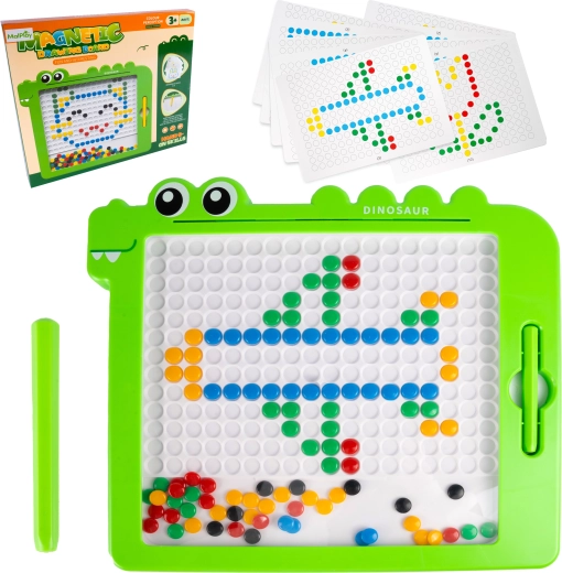 Questa lavagna magnetica in stile dinosauro è un ottimo strumento per lo sviluppo dei bambini. Con la penna magnetica sollevano le sfere metalliche in superficie creando immagini, forme e lettere. Cancellazione semplice passando il dito o la penna riporta le sfere al loro posto e il divertimento può continuare.
