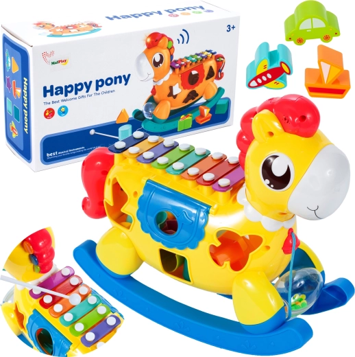 Giocattolo 3 in 1 per i più piccoli: cavallino a dondolo, sorter delle forme e mini cembali. Girando la coda con perline nascoste si sente un gradevole sonaglio, che favorisce la percezione uditiva. Ottima scelta per bambini dai 3 anni per sviluppare motricità, coordinazione e creatività.
