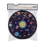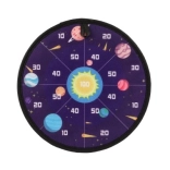 Un lato del bersaglio è progettato con colori vivaci e numeri per il gioco tradizionale, mentre l’altro lato presenta un tema spaziale con immagini di pianeti. I bambini possono esercitarsi in matematica sommando i punti ottenuti con i singoli lanci.