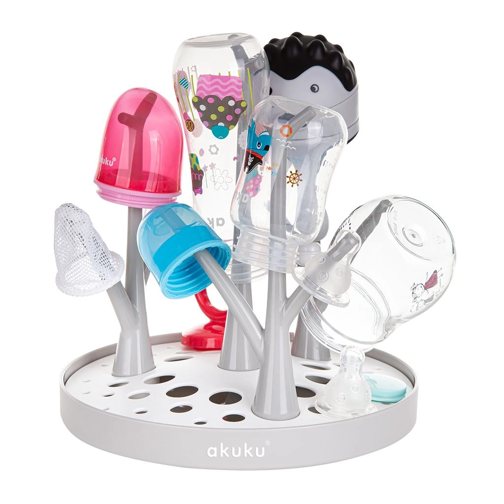 Il pratico e compatto scolabottiglie per biberon e accessori AKUKU garantisce un asciugatura igienica di biberon, tettarelle e accessori a casa e in viaggio. Ha compatibilità universale con tutti i tipi di bottiglie, è facile da piegare e pulire e, grazie alla base appositamente sagomata, convoglia efficacemente l’acqua anche fuori dal lavello. Realizzato con materiali sicuri senza BPA.