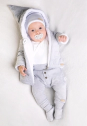 La pratica zip a tutta lunghezza facilita la vestizione senza dover infilare il capo dalla testa. Il set include una comoda cuffietta in cotone, che avvolge dolcemente la testa e completa l’outfit per il clima freddo.