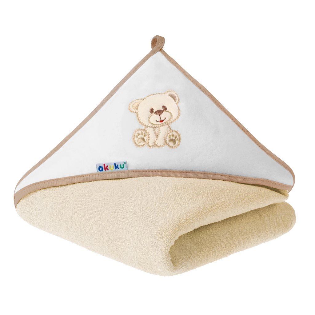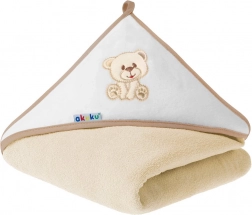 Morbido e soffice asciugamano con cappuccio AKUKU per bambini, con un tenero motivo orsetto, offre il massimo comfort al bebè dopo il bagnetto. Lato interno in 100% cotone delicato sulla pelle sensibile, mentre lo strato esterno in pile dona un piacevole calore. Pratica dimensione 100 × 100 cm e cappuccio per un avvolgimento rapido dopo il bagno.
