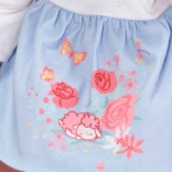 Sophia indossa un vestito con farfalle fragola e vaniglia, leggings rosa e scarpette che la rendono una bambola elegante.