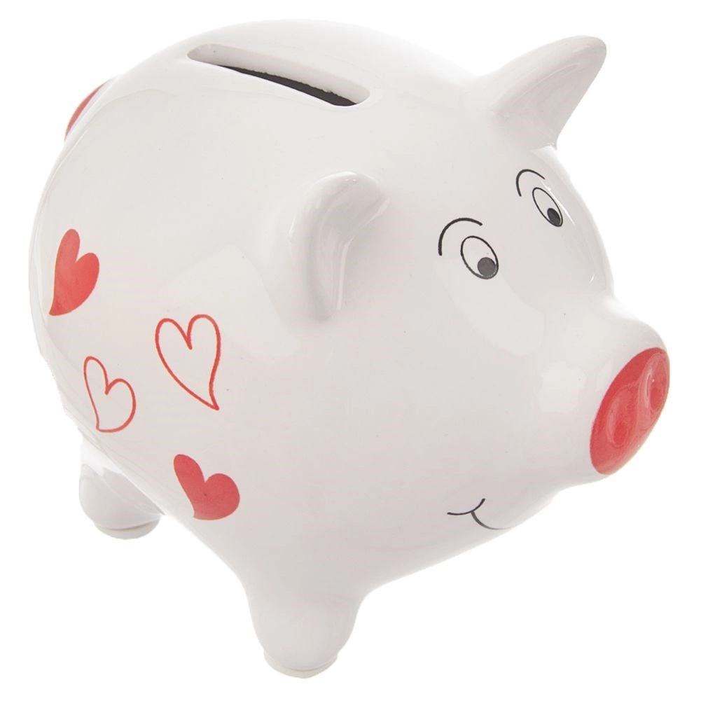 Adorabile salvadanaio in ceramica a forma di maialino con motivo a cuoricini, ideale per i risparmi quotidiani. Ha dimensioni compatte e una base stabile a quattro zampe, quindi sta benissimo sia su mensole che su tavoli. Grazie alla ceramica bianca di qualità con dettagli rossi è resistente e al contempo un accessorio d’arredo elegante. La pratica apertura sul fondo permette di prelevare i risparmi senza rompere il salvadanaio.