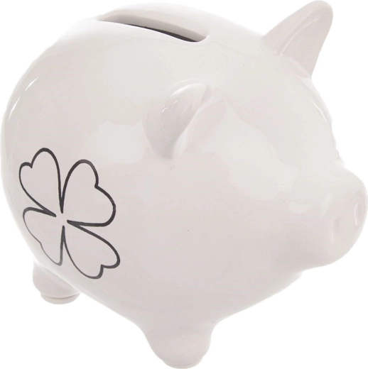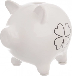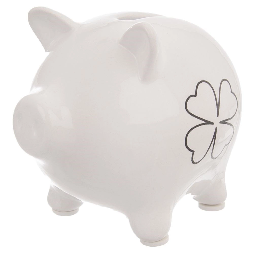 Elegante salvadanio bianco in ceramica a forma di maialino con motivo di foglia di trifoglio che ti insegna a risparmiare e allo stesso tempo decora l’interno. Realizzato in ceramica di qualità con smalto lucido. Non ha un’apertura per prelevare le monete: il denaro può essere rimosso solo rompendolo, favorendo un risparmio disciplinato. Un’ottima idea regalo per bambini e adulti.