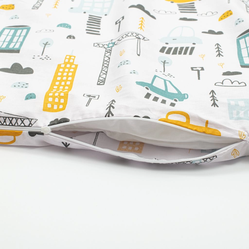 Scopri il comfort e la sicurezza offerti al tuo bimbo dal set biancheria da letto 3 pezzi per lettino NEW BABY con motivo città nel popolare tono senape. Il set è realizzato in cotone 100%, piacevole al tatto, traspirante e delicato sulla pelle sensibile dei bambini. La pratica realizzazione con cerniere sicure senza cursori pendenti e il morbido paracolpi per la protezione nel lettino rendono questo set una scelta ottimale per l’uso quotidiano.