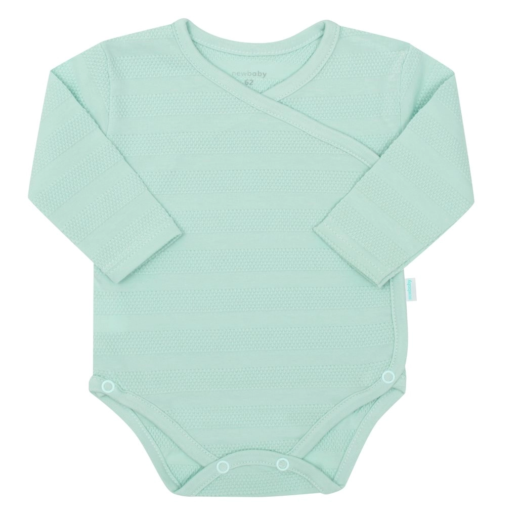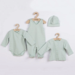 Elegante e confortevole set neonato per la maternità New Baby I AM nel colore menta composto da 4 pratici capi: body incrociato, tutina, cardigan e cuffietta. Realizzato in 100% cotone, morbido, traspirante e delicato sulla pelle sensibile dei neonati. Facile da usare grazie ai bottoncini a pressione su tutta la lunghezza, che facilitano vestizione e cambio.