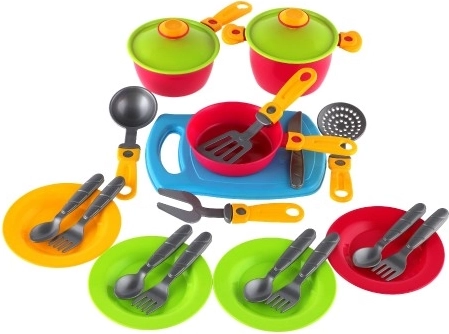 Questo set colorato di stoviglie con tagliere è perfetto per le cucine giocattolo e i giochi di cucina. La plastica leggera ma robusta garantisce un uso sicuro e duraturo, e i singoli pezzi sono comodi da impugnare per i bambini.