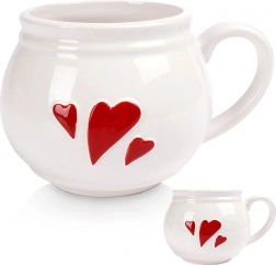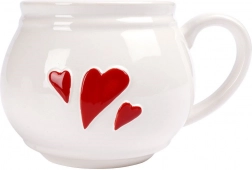 Elegante tazza bianca in ceramica con cuoricini rossi in rilievo e manico ergonomico, ideale per il consumo quotidiano di caffè, tè e cacao. Offre un volume di 430 ml, una struttura resistente, possibilità di lavaggio in lavastoviglie e uso nel microonde. Perfetta anche per il vino caldo e, grazie al design romantico, è un ottimo regalo.