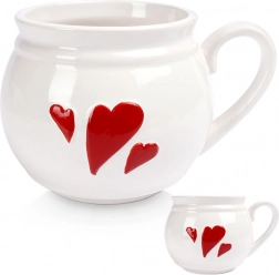 Grande tazza in ceramica da 800 ml con cuoricini rossi in rilievo, ideale per tè, caffè, cacao e vin brulè. Ha un manico comodo, è facile da pulire in lavastoviglie ed è adatta al microonde. La forma classica “panciuta” si adatta perfettamente alla mano e impreziosisce ogni tavola.