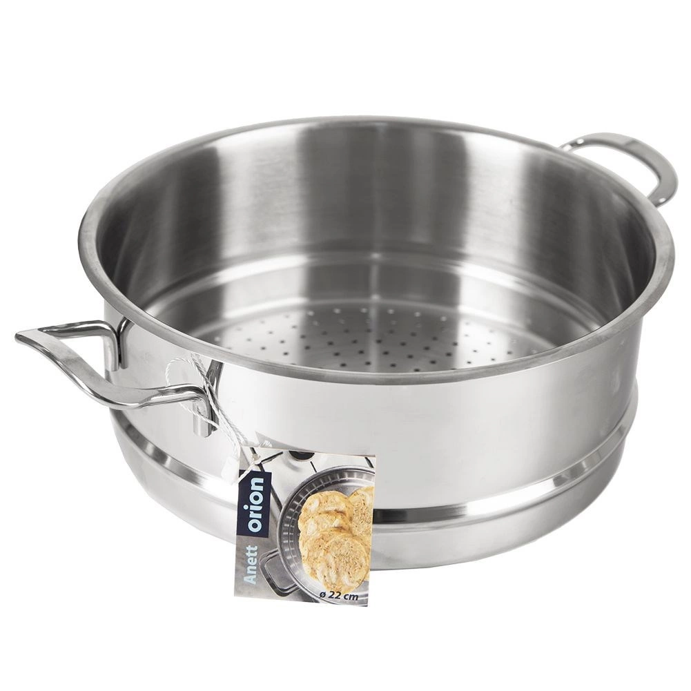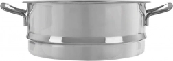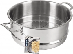 Grazie al fondo perforato il vapore circola in modo uniforme, mentre l’anello sagomato lungo il perimetro assicura un appoggio stabile sulla pentola e riduce la fuoriuscita di vapore. I manici fissati con rivetti facilitano una manipolazione sicura. L’inserto è compatibile con pentole di 24 cm di diametro e si lava senza sforzo in lavastoviglie.