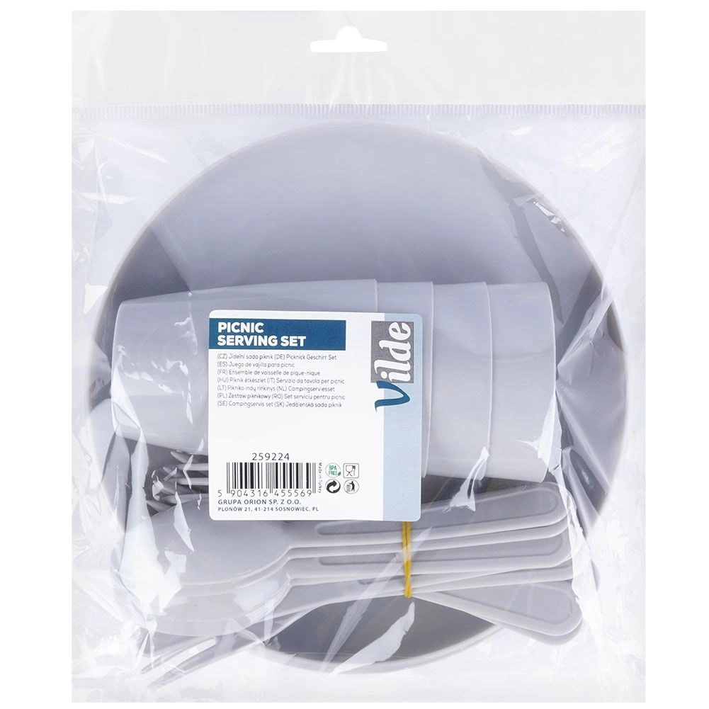 Goditi i pasti all’aperto senza pensieri. Questo pratico set contiene tutto il necessario per servire bevande, piatti principali e snack. Grazie al peso ridotto e al materiale resistente è perfetto per picnic, campeggio e giardino. Adatto per adulti e bambini.