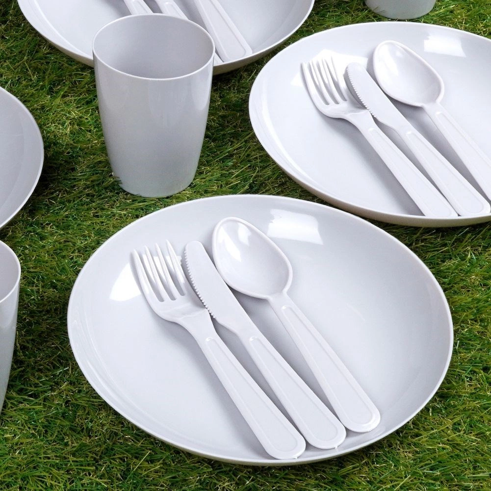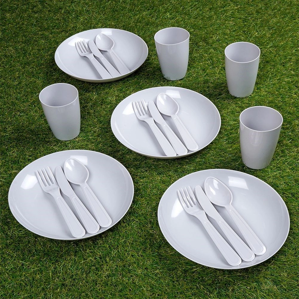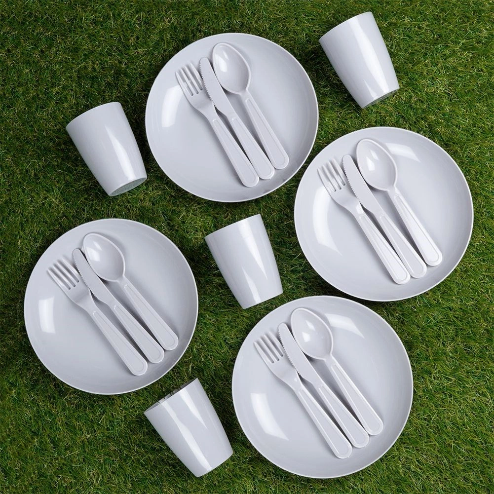 Set picnic completo in plastica per 4 persone con in totale 20 pezzi, ideale per gite, giardino e campeggio. Include quattro bicchieri, piatti e posate. È leggero, resistente, senza BPA e riutilizzabile – un’ottima alternativa ai prodotti monouso.