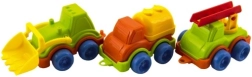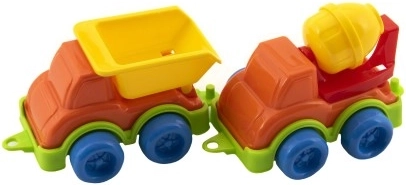 Ribaltabile, betoniera e altri mezzi invitano al gioco creativo. I bambini possono trasportare, caricare e “costruire” secondo la loro fantasia.