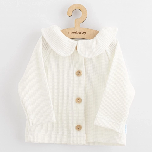 Elegante giacchina/cardigan da bambina NEW BABY Laura in colore bianco, realizzata in 100% cotone con pratica chiusura a bottoni. Bellissimi bottoncini in legno e colletto donano alla giacca un look elegante e di stile. Adatta per tutto l’anno – per l’uso quotidiano e le occasioni speciali.