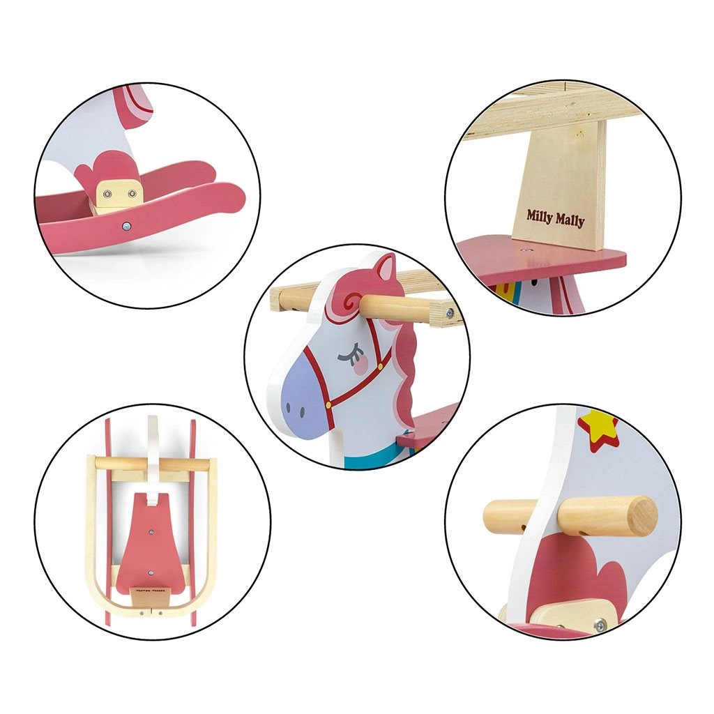 Il dolce cavalluccio a dondolo in legno MILLY MALLY Lucky in colore rosa offre tanto divertimento sicuro ai bambini da 12 a 36 mesi. Dispone di barriere di sicurezza rimovibili, maniglie per una presa salda, poggiapiedi e slitte profilate e stabili per un dondolio confortevole ed equilibrato. Realizzato in legno di alta qualità e rifinito con vernici atossiche ed ecologiche.