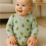 Body leggerissimo e traspirante in mussola con maniche lunghe e pratica allacciatura laterale. Interamente stampato con motivo avocado, realizzato in 100% cotone per la pelle sensibile dei bambini. La mussola garantisce ottima traspirabilità, è morbida, resistente e ad ogni lavaggio diventa ancora più soffice. Chiusura con laccetti sul fianco e bottoncini a pressione tra le gambine per un facile cambio.
