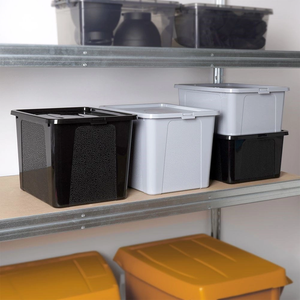 Utilizzala per riporre in modo ordinato biancheria da letto, giocattoli, abbigliamento, tessili, utensili da cucina, attrezzi, libri o documenti. L’elegante finitura nera con delicato rilievo si inserisce perfettamente in interni moderni e locali tecnici.