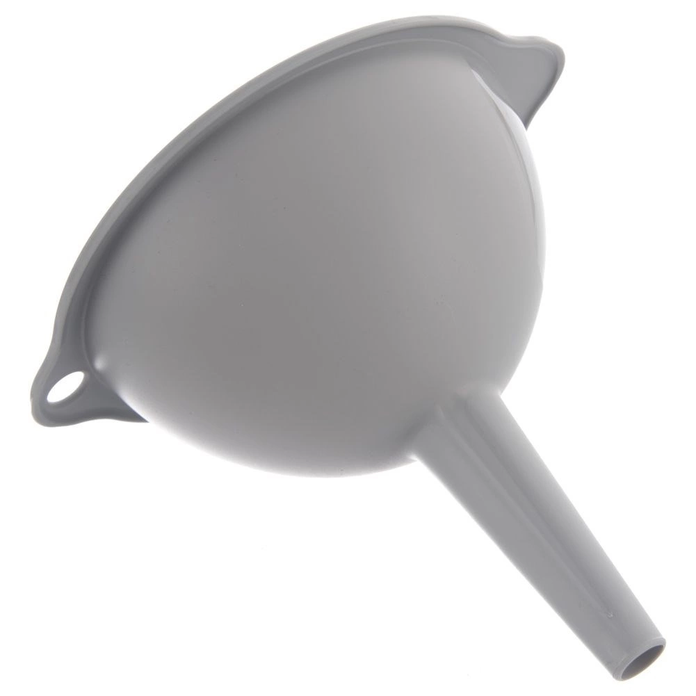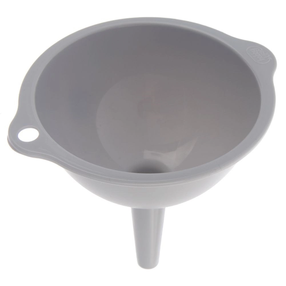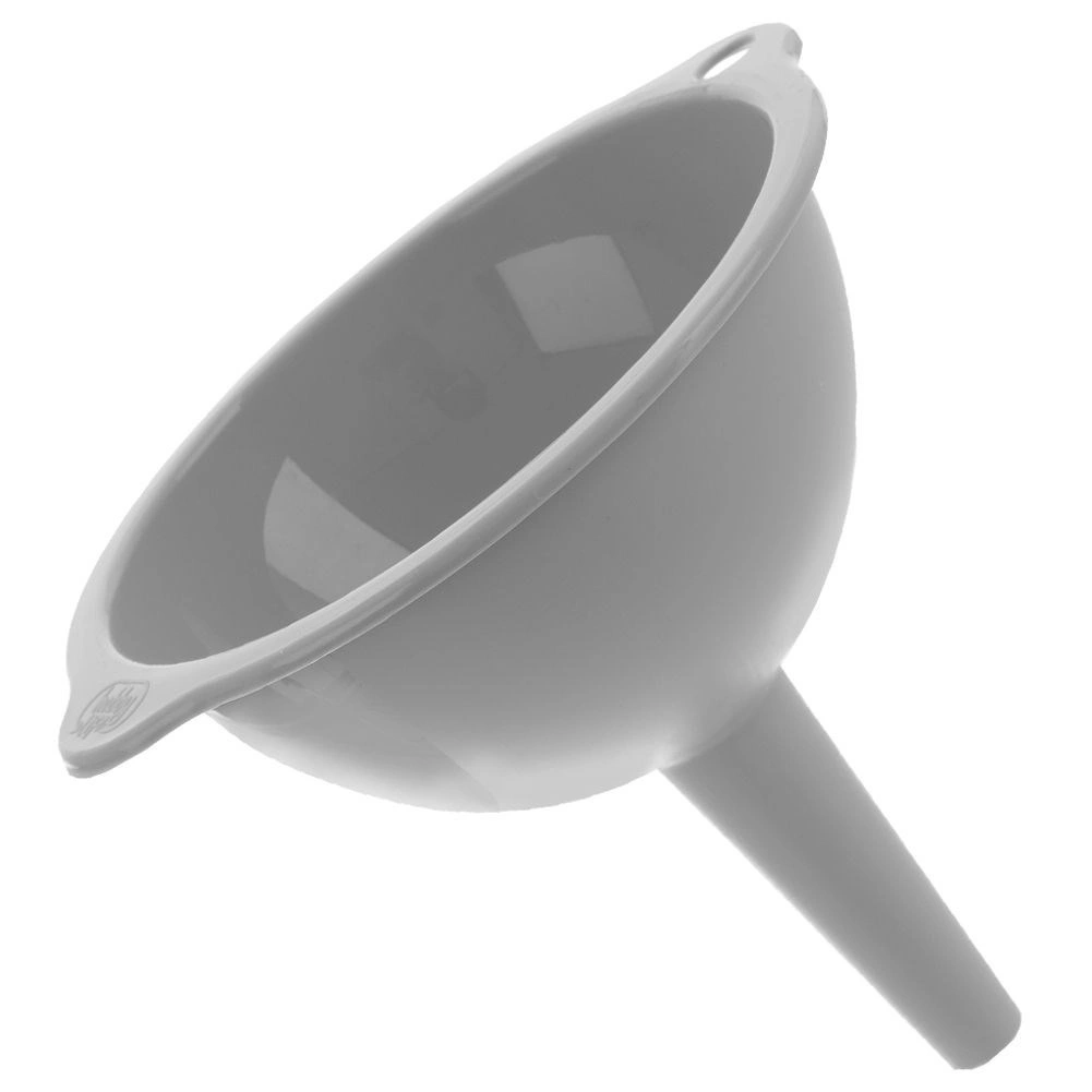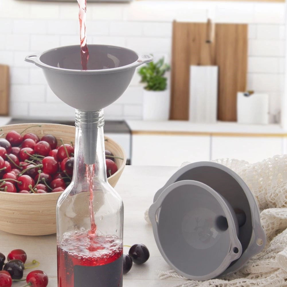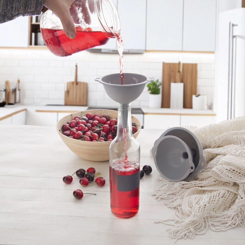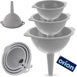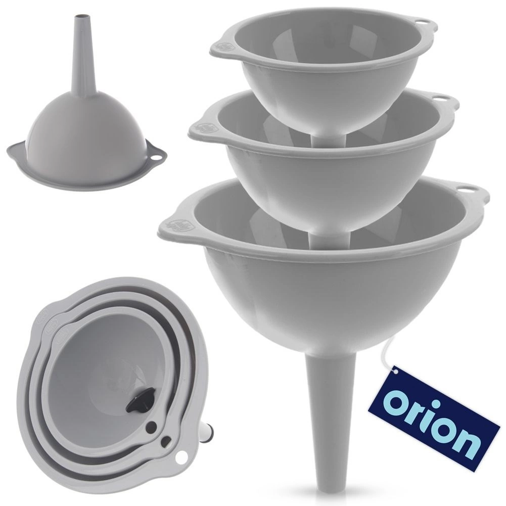 Il set di tre imbuti in misure universali facilita le attività quotidiane in cucina. I diversi diametri consentono un riempimento preciso di bottiglie, vasetti e barattoli senza fuoriuscite. La struttura resistente in plastica di alta qualità di colore grigio è leggera e al tempo stesso duratura, così gli imbuti resistono a un uso prolungato.
