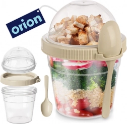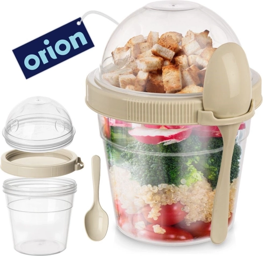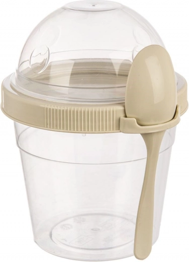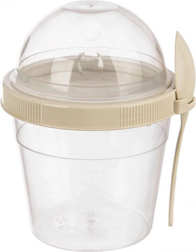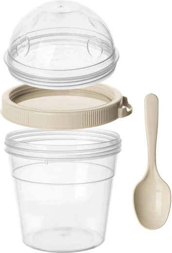 Pratico bicchiere per yogurt con ciotola separata per muesli e cucchiaino integrato, ideale per i viaggi, il lavoro e la scuola. Offre una capacità di 400 ml per lo yogurt e 150 ml per i topping croccanti, un coperchio ermetico anti-perdita e una struttura resistente senza BPA adatta a lavastoviglie, congelatore e microonde (senza coperchio).