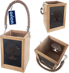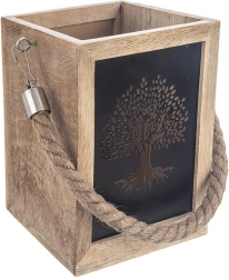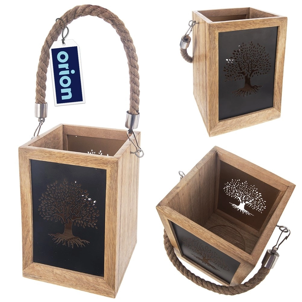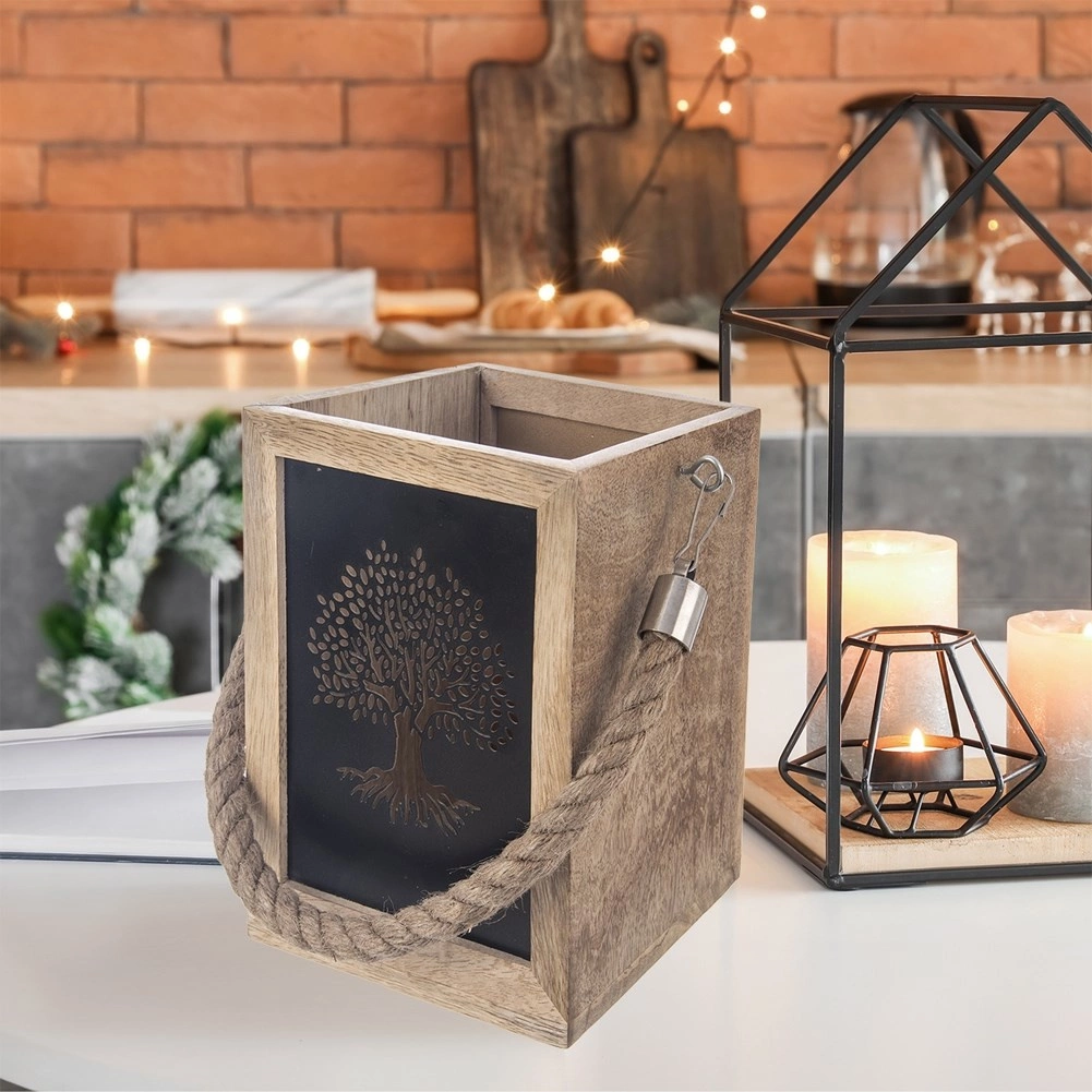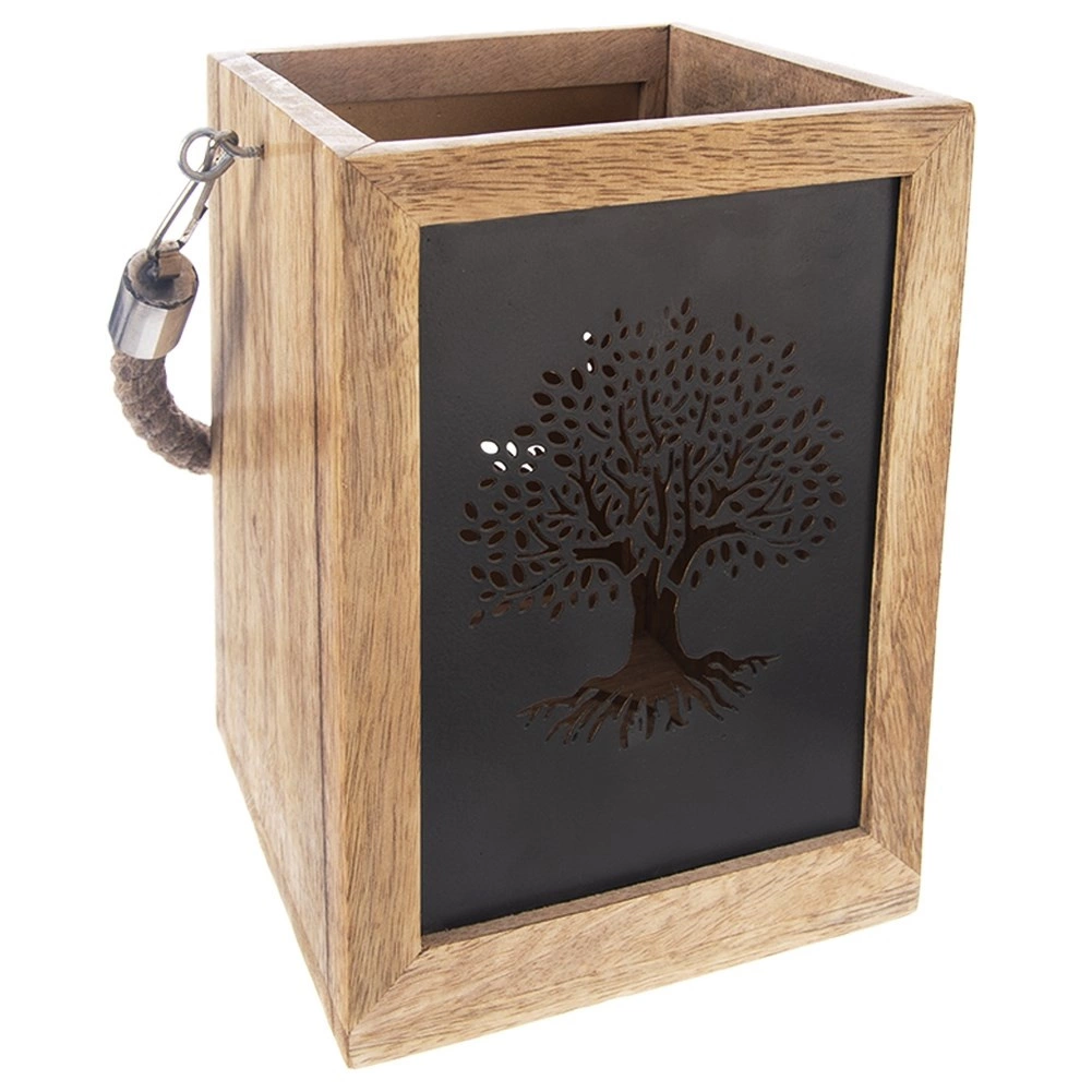 Elegante lanterna in legno di mango con pannelli in metallo nero e intaglio a forma di albero che, una volta accesa la candela, crea una suggestiva decorazione luminosa. Grazie alla robusta maniglia in corda si trasporta e si appende facilmente, mentre la parte superiore aperta garantisce una ventilazione sicura. Ideale per candeline tealight e candele classiche, per balcone, terrazza e interni.