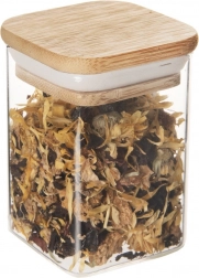 Questo barattolo dal design curato unisce vetro borosilicato e coperchio in bambù con guarnizione in silicone per una chiusura affidabilmente ermetica. Il vetro trasparente permette un controllo immediato del contenuto, mentre il coperchio elegante aggiunge un tocco naturale a mensole e piano di lavoro. Grazie alle dimensioni compatte, fa risparmiare spazio e si combina facilmente in set.