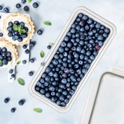 Il profilo basso e il coperchio piatto fanno risparmiare spazio in frigorifero e permettono di impilare in sicurezza più contenitori.