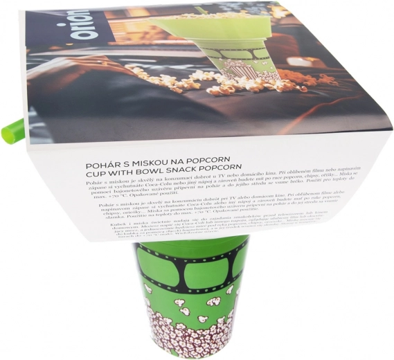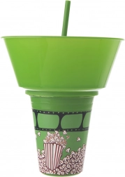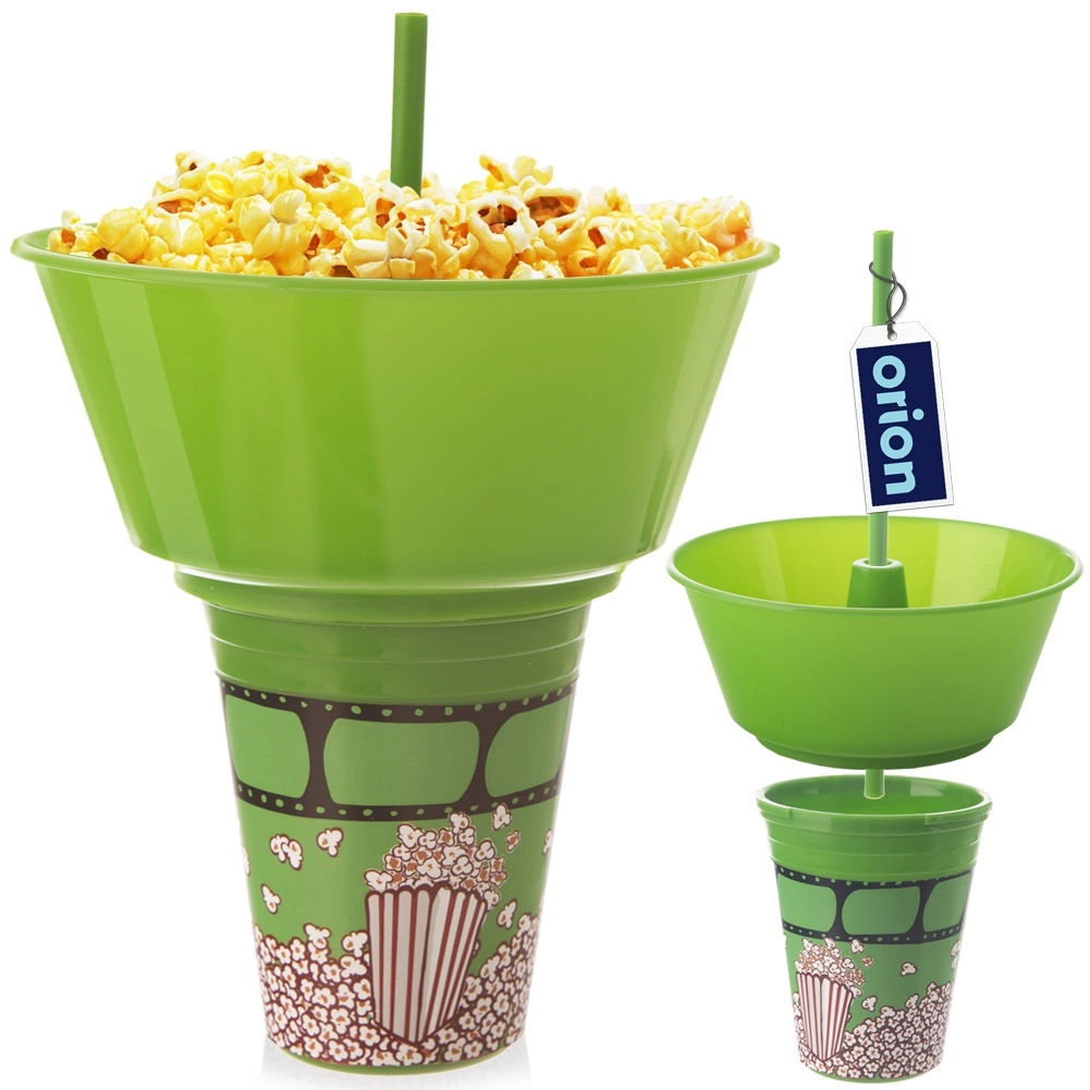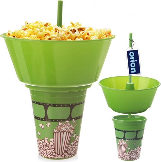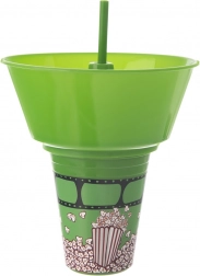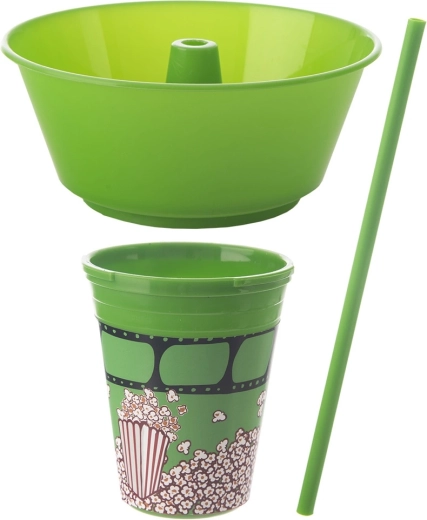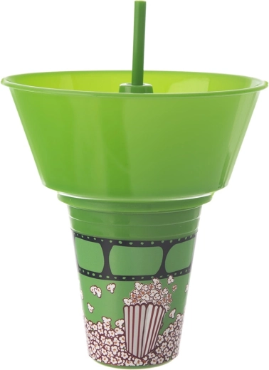La pratica soluzione 2-in-1 combina un bicchiere inferiore per la bevanda e una ciotola superiore rimovibile per popcorn o altri snack. La cannuccia integrata al centro consente di bere senza interrompere il divertimento, mentre la ciotola offre spazio a sufficienza per uno spuntino comodo. Il design verde con motivo popcorn ha un ottimo aspetto a casa e durante le uscite al cinema.