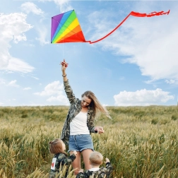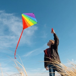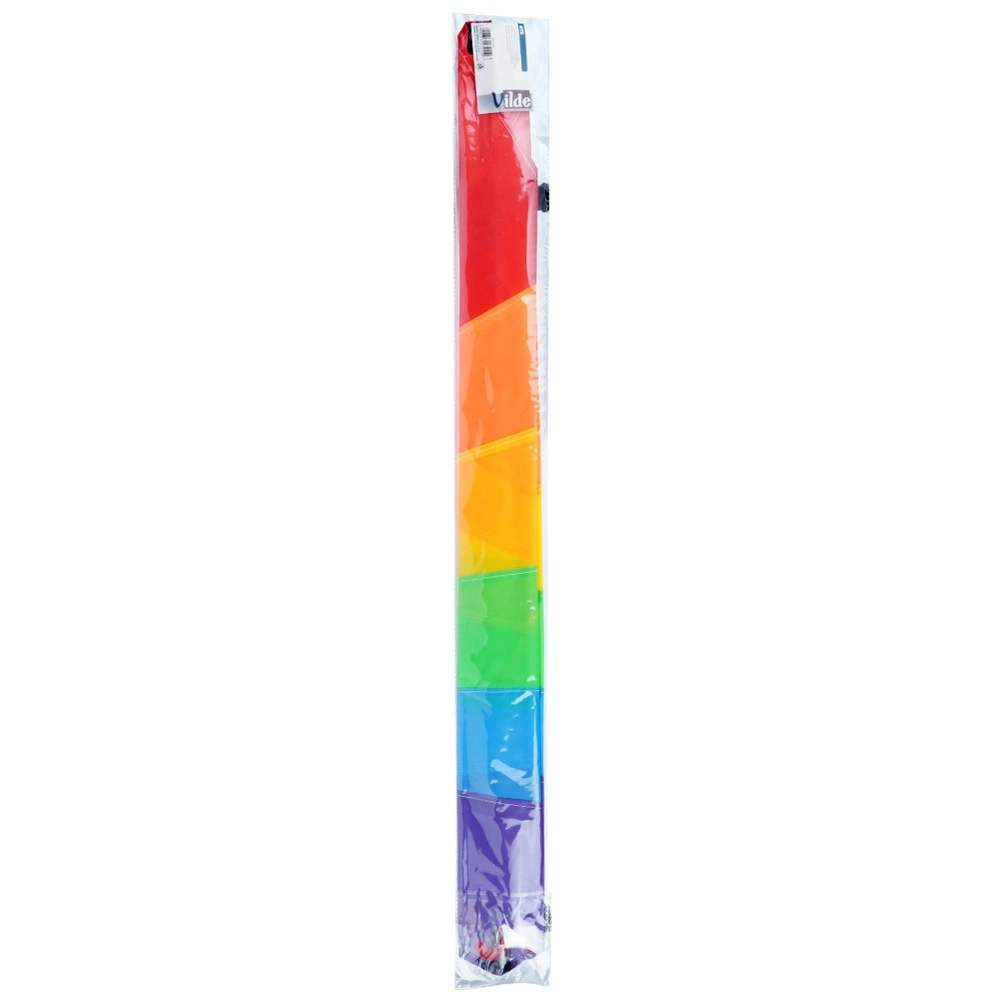 Questo aquilone arcobaleno in poliestere di qualità entusiasmerà bambini e adulti. Grazie alla costruzione leggera si solleva facilmente e la lunga coda gli conferisce ottima stabilità al vento. Adatto per spiaggia, giardino e ampi prati.